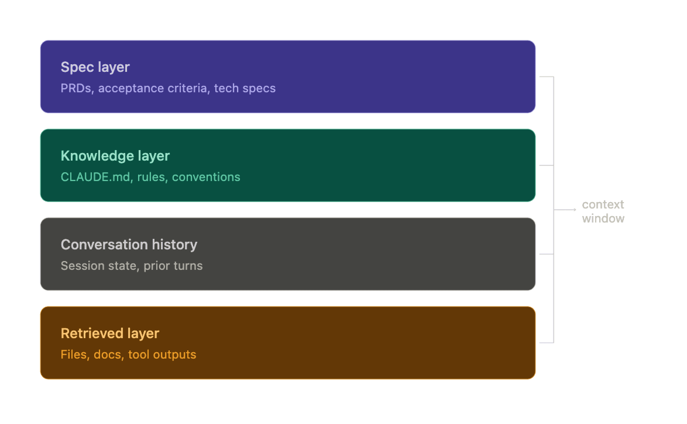 What is the most underused layer of context? The spec layer. Most teams skip it entirely and hand the model a vague task description. Even a short PRD with clear acceptance criteria dramatically changes output quality, because it eliminates the gap that the model would otherwise fill with its own assumptions.