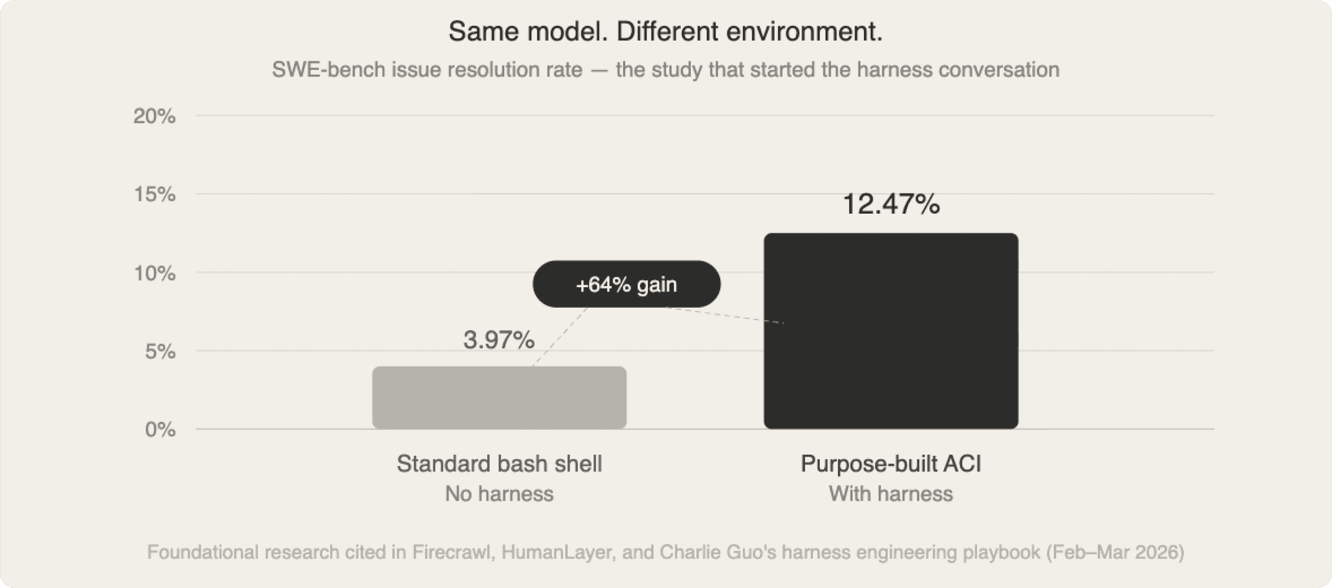 The clearest empirical proof of this came from research that the harness engineering community keeps coming back to. Researchers tested the same model on identical coding tasks — real GitHub issues from popular open source repositories — using two different environments.