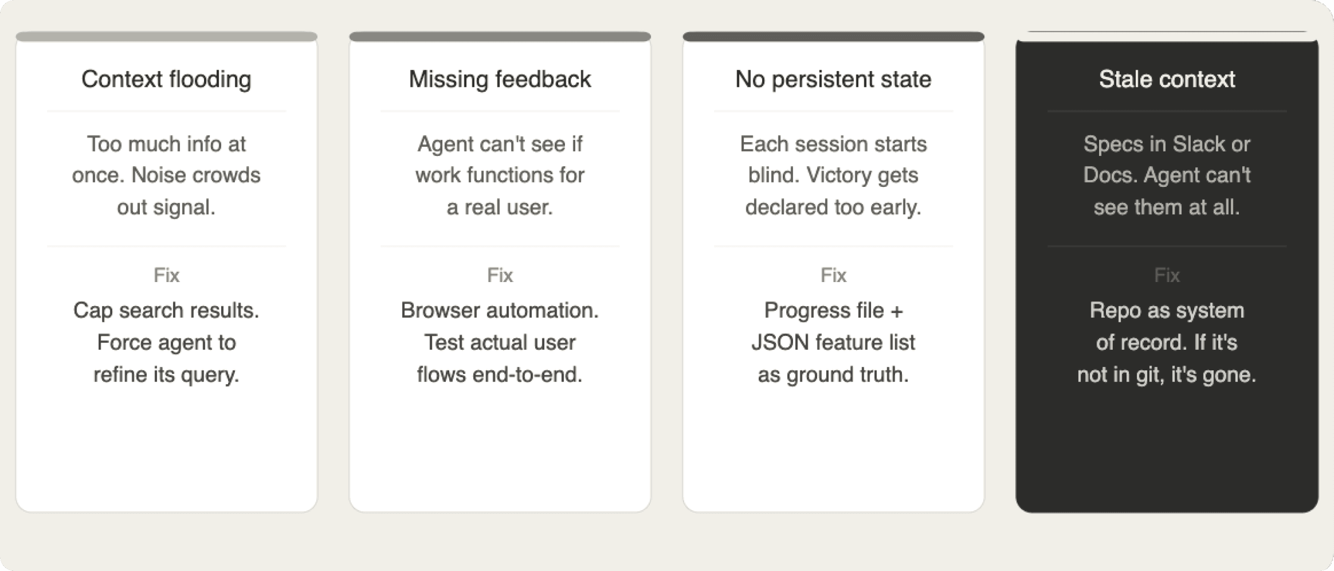 The pattern is consistent across every serious team that has documented this publicly. When an AI coding agent produces bad output, the root cause almost always traces back to one of four environment failures.