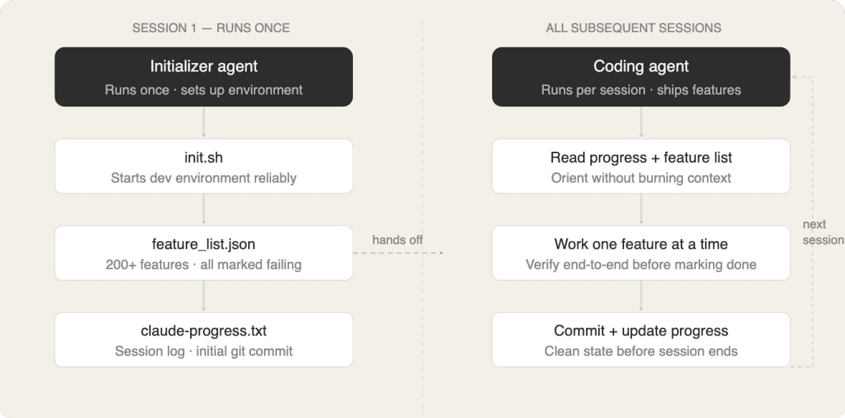 The solution was a two-part harness. An initializer agent runs once and creates three things.